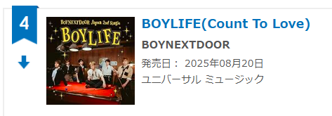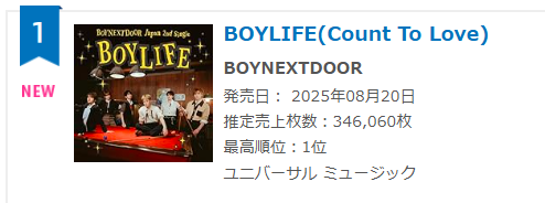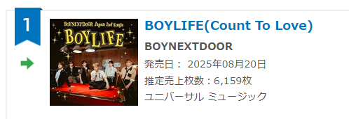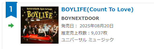 BOYNEXTDOORが8月20日にリリースした日本2ndシングル「BOYLIFE」の初動売上成績を以下に記載します。