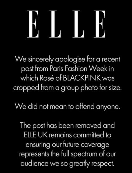 『ELLE UK』は10月2日、パリ・ファッション・ウィーク中に撮影された写真からBLACKPINKのロゼを切り取ったことについて、謝罪声明を発表しました。