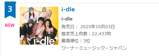 i-dleが10月3日にリリースした日本1st EP『i-dle』(タイトル曲「どうしよっかな」)が、22,432枚を売り上げ、オリコン週間アルバムランキングで3位を記録しました。