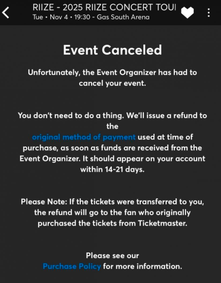 RIIZEは11月4日に北米の「ガス・サウス・アリーナ」で予定していた公演がキャンセルされました。「ガス・サウス・アリーナ」の収容人数は約13,000人です。
