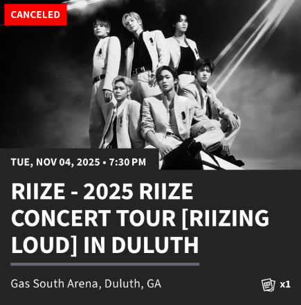 RIIZEは11月4日に北米の「ガス・サウス・アリーナ」で予定していた公演がキャンセルされました。「ガス・サウス・アリーナ」の収容人数は約13,000人です。