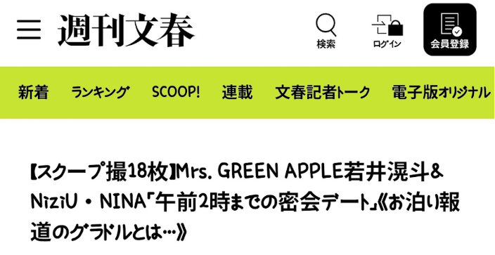 NiziUのニナが、Mrs. GREEN APPLEの若井滉斗とデートしている様子を、週刊文春が報じました。