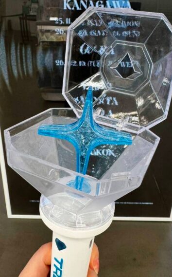 新しいペンライトは、TREASUREの象徴的なロゴや鮮やかなカラーパレットを取り入れた、洗練されたモダンなデザインが特徴です。カスタマイズ可能なライティング機能やBluetooth接続機能を搭載しており、グループの楽曲と同期してパフォーマンス中にダイナミックな光の演出を楽しむことができます。