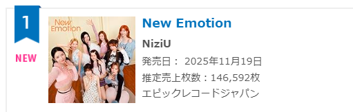 NiziUが11月19日にリリースした3rdアルバム『New Emotion』の初動売上成績について以下に記載します。初日はオリコンデイリーアルバムランキングで1位を獲得しました。