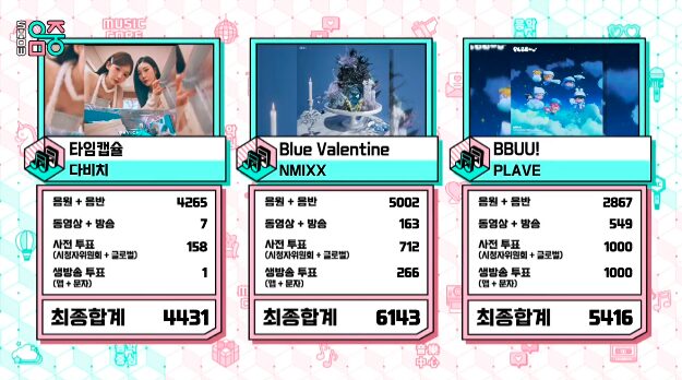 NMIXXの「Blue Valentine」は9冠目です。音楽中心3冠(トリプルクラウン)のため次週からノミネート外となります。