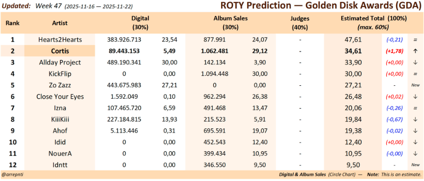トップ予想はHearts2Heartsで、続いてCORTIS、ALLDAY PROJECTが有力とされています。しかし、現時点でHearts2Heartsは授賞式に出席しない予定です。