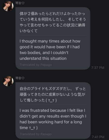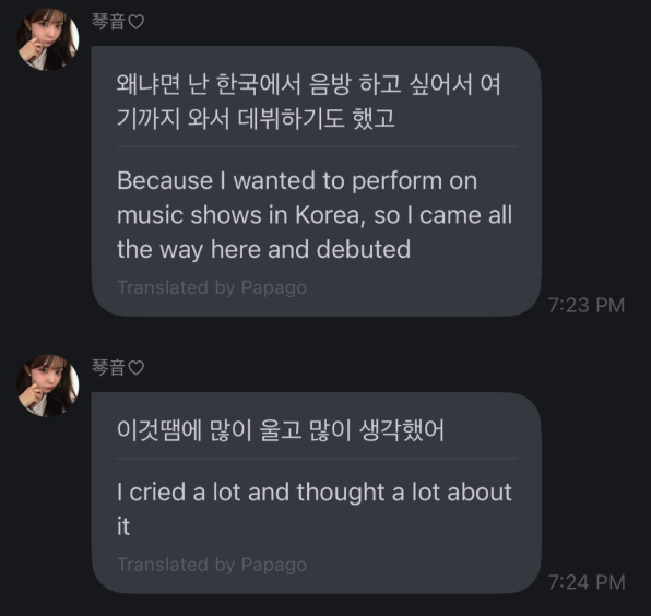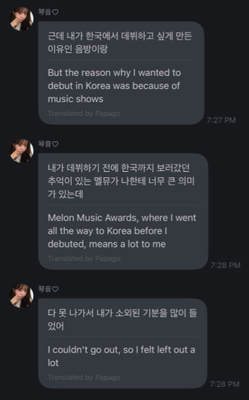 コトネはオンラインコミュニケーションツールで、サブユニット「tripleS ∞!」の日本でのスケジュールが重なったため、韓国の音楽番組や年末式典に出演できないことへの落胆を伝えています。メッセージからは、「MMA」などの授賞式に出場することを目標にしていた様子もうかがえました。