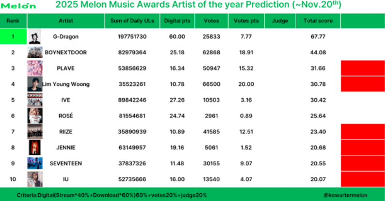 G-DRAGON、BOYNEXTDOOR、PLAVEが上位予想です。