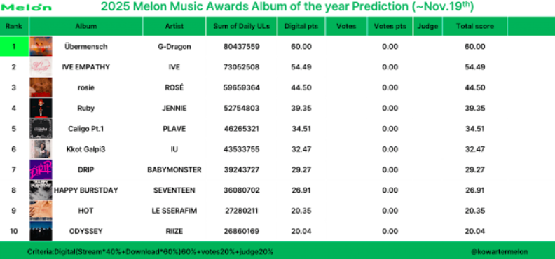 12月20日に開催される「Melon Music Awards 2025」(MMA2025)の大賞予想を以下に記載します。