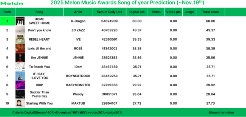 G-DRAGON「HOME SWEET HOME」、ZO ZAZZ「Don’t you Know」、IVE「REBEL HEART」が上位予想です。