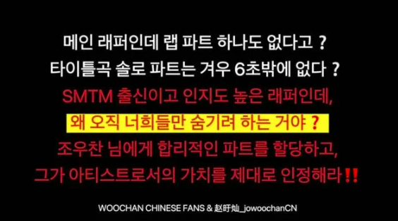 12月10日、中国のファンがTHE BLACK LABEL本社でトラック抗議活動を行い、「ウチャンが受けてきた無礼な扱い」に抗議していると主張しました。ファンは、ウチャンに関する悪意のある虚偽情報が意図的に拡散され、事務所が「ウチャンのラッパーとしてのアイデンティティを曖昧にしている」と主張しました。
