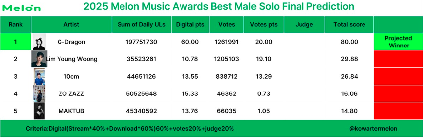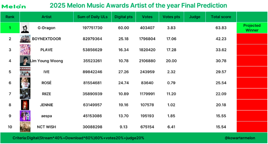 G-DRAGON、BOYNEXTDOOR、PLAVEが上位予想です。