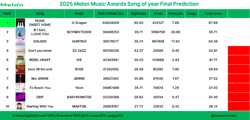 G-DRAGON「HOME SWEET HOME」、BOYNEXTDOOR「IF I SAY I LOVE YOU」、HUNTR/X「GOLDEN」が上位予想です。