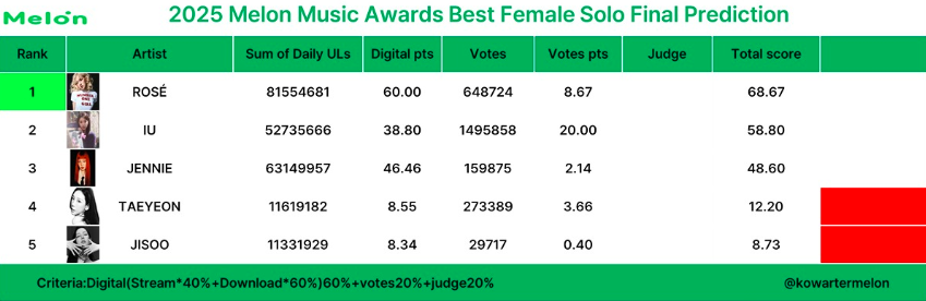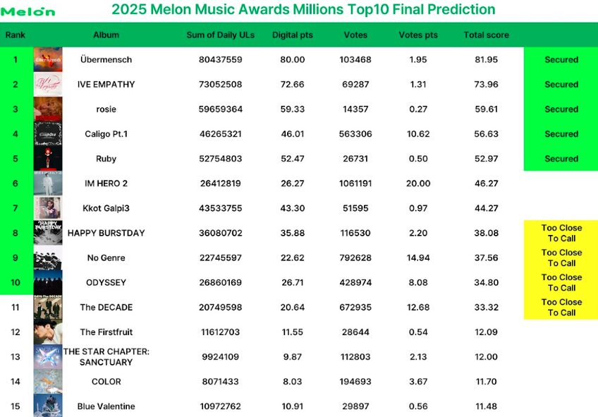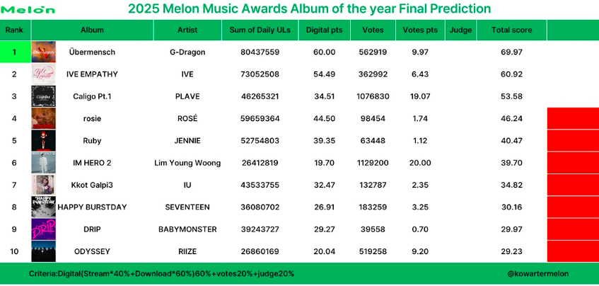 10作品選ばれます。上位5作品(G-DRAGON、IVE、ロゼ、PLAVE、ジェニー)はほぼ当確です。