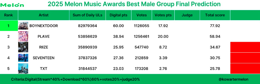 BOYNEXTDOOR、PLAVE、RIIZEが上位予想です。