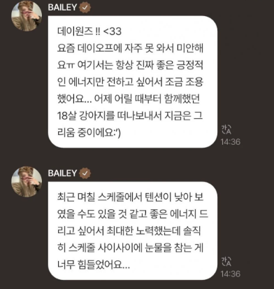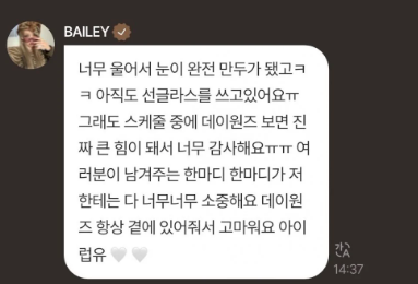 ベイリーは、ALLDAY PROJECTのプライベートメッセージサービスを通じてファンに近況を伝え、ファンダム「DAY ONE」に向けて次のようなメッセージを綴りました。