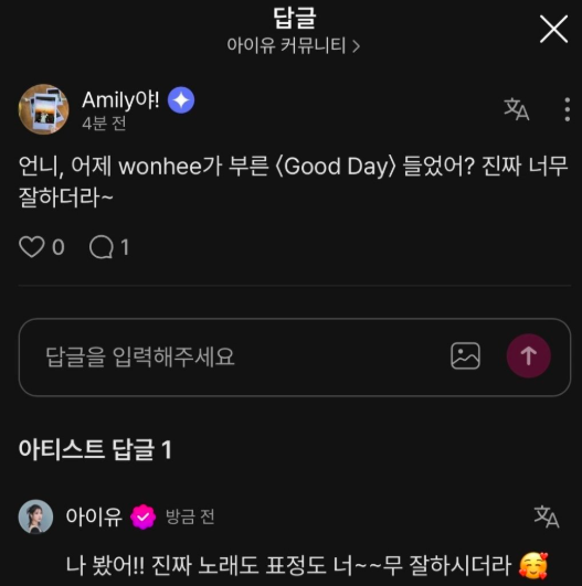 翌日、IUはファンコミュニケーションプラットフォーム「Berriz」を通じてファンに新年の挨拶を投稿しました。その中で、ウォンヒの「Good Day」カバーを見たかというファンの質問に対し、「見ました!!歌も表情も本当に素晴らしかったです🥰」とコメントしています。