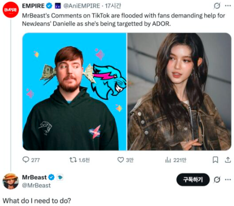 世界で最も多くのチャンネル登録者数を誇るYouTuber、ミスタービーストが、NewJeansファンからの助けを求める声に反応しました。