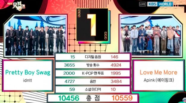 この日、ENHYPENとALPHA DRIVE ONEが1位候補に挙がり、最終的にALPHA DRIVE ONEの「Freak Alarm」が1位を獲得しました。しかし、放送では先週のノミネートされたidnttとApinkの名前が誤って表示されました。