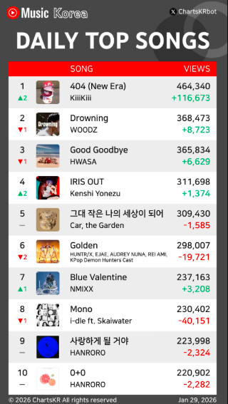 同楽曲は1月29日付のYouTube Musicコリアにおいて、ストリーミング数464,340回を記録し、1位を獲得しました。これはWOODZの「Drowning」やファサの「Good Goodbye」を上回る結果となります。