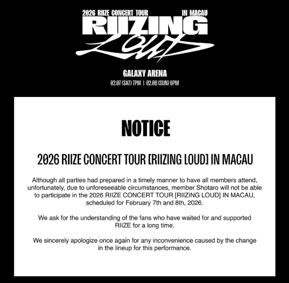 2月6日、イベント制作会社IME MACAUは公式SNSを通じて、「ショウタロウは2026年コンサートツアー『RIIZING LOUD』マカオ公演に出演しない。すべてのメンバーが参加できるよう準備を進めてきたが、予期せぬ事情により出演できなくなった」と説明し、ファンに理解を求めるとともに、ラインナップ変更について謝罪しました。