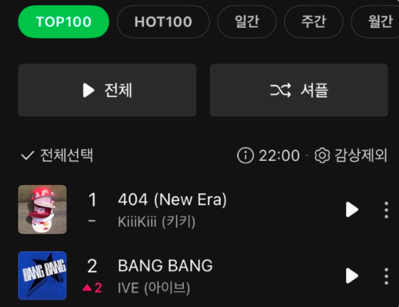 2月11日22時時点のMelOnチャートでは、KiiiKiiiの「New Era」が1位、IVEの「BANG BANG」が2位を記録し、スターシップ所属アーティストがトップ2を独占しました。