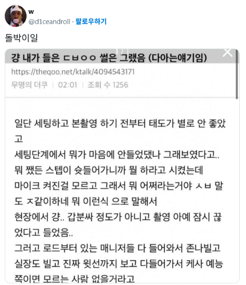 この投稿は、ステージの準備から撮影まで、彼の態度が悪かったと言っている。マイクがオンになっていることに気づかず、マイクに向かって悪態をついていた。撮影中の雰囲気を台無しにした。