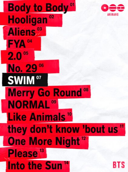 BTS (방탄소년단) 'ARIRANG' Tracklist#BTS #방탄소년단#BTS_ARIRANG #BTS_SWIM pic.twitter.com/ccFfacDLbC