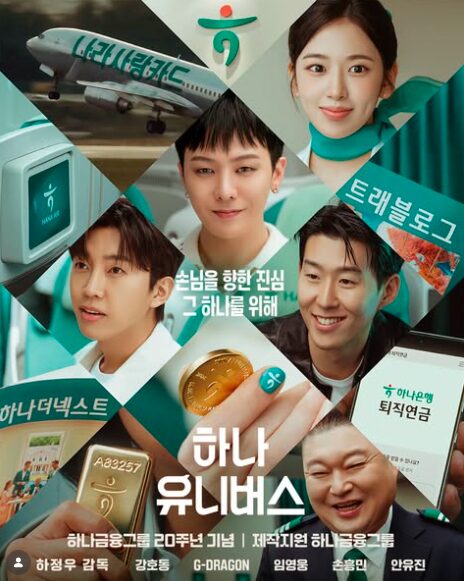 ハナ銀行グループの20周年キャンペーン「Hana universe」が公開され、モデルを務めるG-DRAGON、イム・ヨンウン、ソン・フンミン、IVEのユジン、カン・ホドンが一堂に会しました。