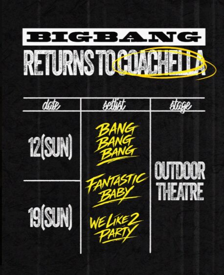 BIGBANG は4月13日と20日に、7つあるステージの一つであり、フェスティバルで2番目に大きな野外会場であるアウトドアシアターでヘッドライナーを務める予定です。