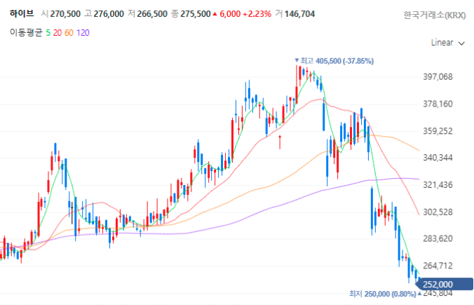 HYBEの株価は、カムバック前の2月19日に年初来高値405,500を記録しましたが、カムバック当日の3月20日には344,000、さらに4月10日には254,000まで下落。高値から見ると約38%の下落となっています。